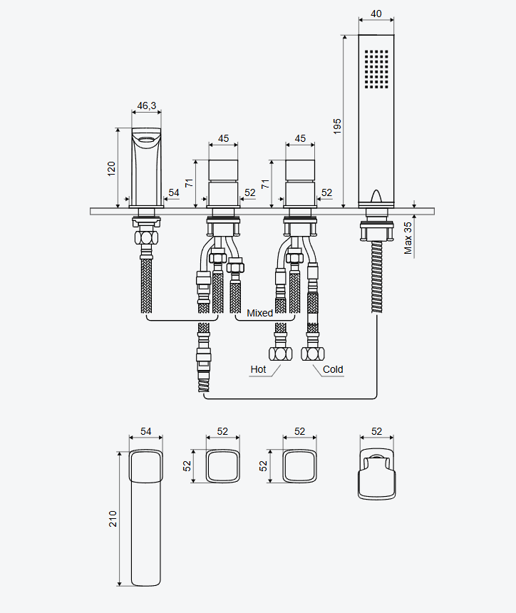- Montage:auf dem Wannenrand oder auf Fliesen mit einer Stärke von bis zu 40 mm und Mindestbreite von 80mm möglich