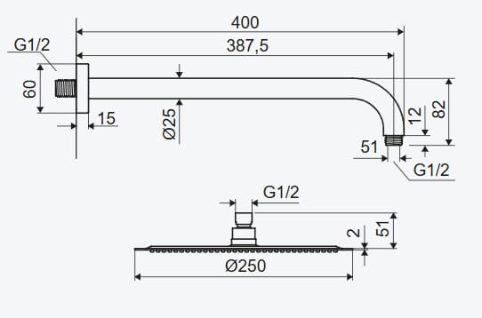 - Der runde Duschkopf mit 250 mm Durchmesser und eckigem Arm kann in der gewünschten Höhe installiert werden. Das Wandanschluss-Set ist die ideale Lösung für Nutzer, die sich bei einer kurzen Dusche nicht die Haare nass machen möchten