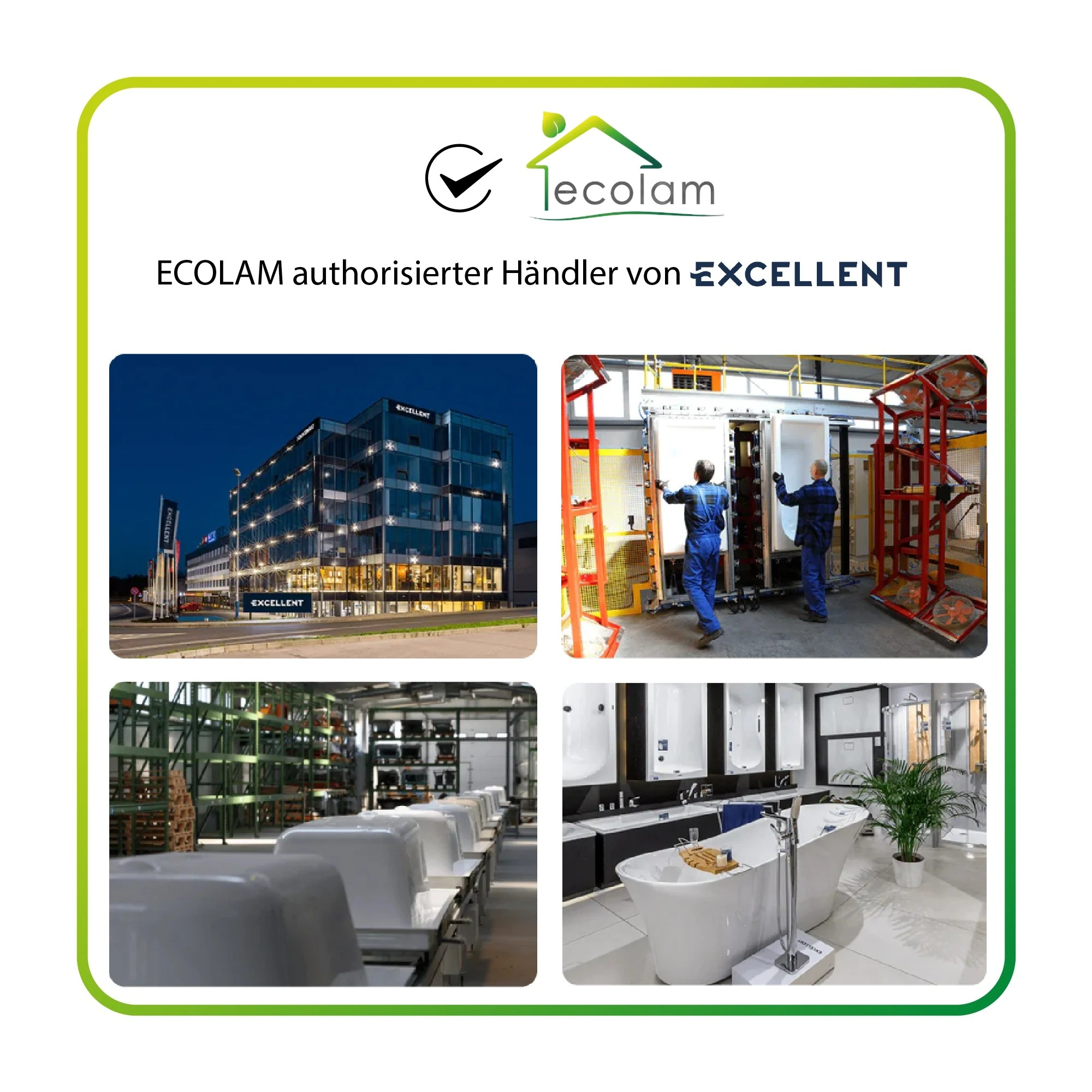 Die Firma ECOLAM authorisierter Händler von EXCELLENT ist seit dem Jahr 2013 auf dem europäischen Markt tätig. Im Bereich Badeinrichtung bieten wir Badewannen, Duschwannen, Armaturen, Duschkabinen, Siphons, Badmöbels usw.