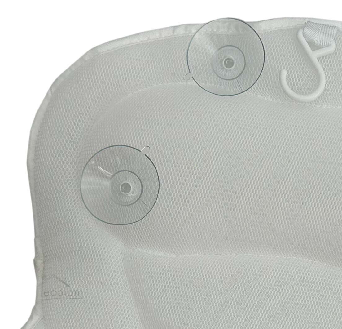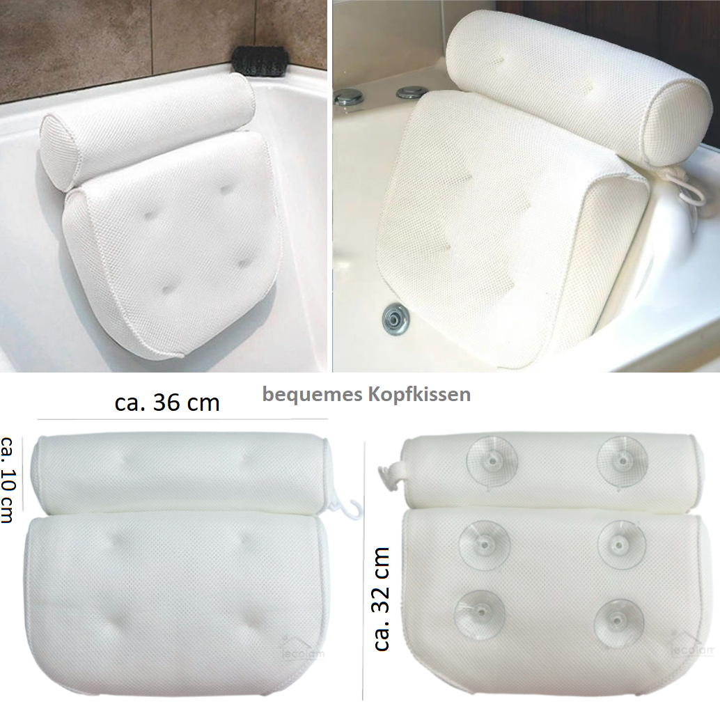 Material: Poliester, thermoplastischer Schaum, schnelltrocknend; Farbe: weiß, leicht zu reinigen, für Waschmaschine geeignet; Montage: einfache Montage mit den Saugnäpfen; bequem - Stützfunktion für Kopf, Nacken, Schulter und Rücken