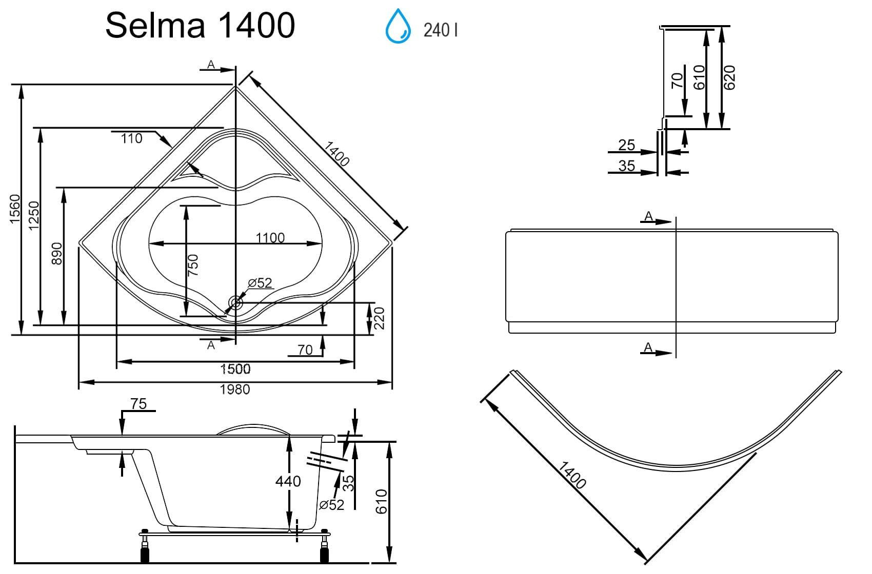 Badewanne Selma 140x140 cm Kopfkissen Sole mit Isolierung Thermobadewanne Eckbadewanne + Siphon Viega