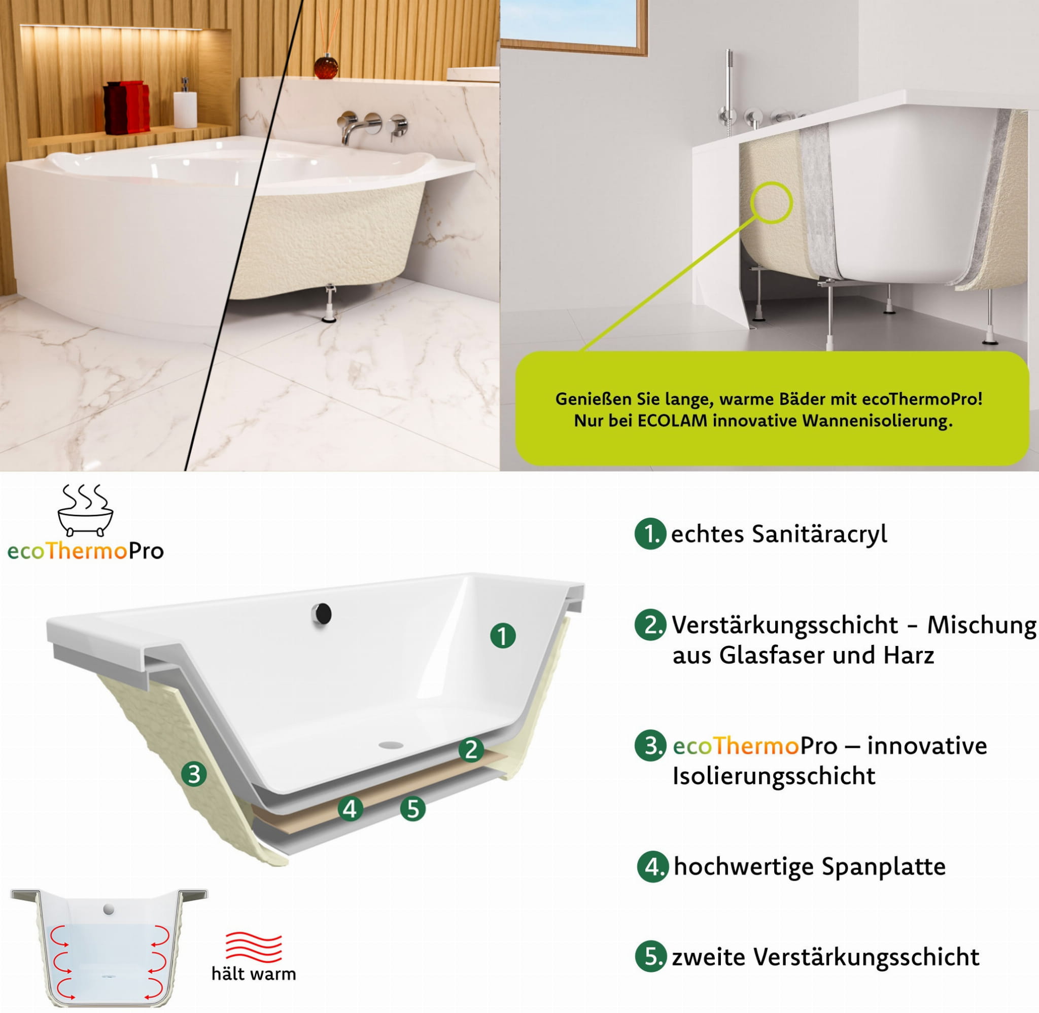 - ✅ Wärmedämmung: die ecoThermoPro Isolierungsschicht verbessert die Wärmedämmung der Wanne. Die innovative Thermoisolierung sorgt für längeres Badevergnügen - Das Badewasser bleibt länger warm.
