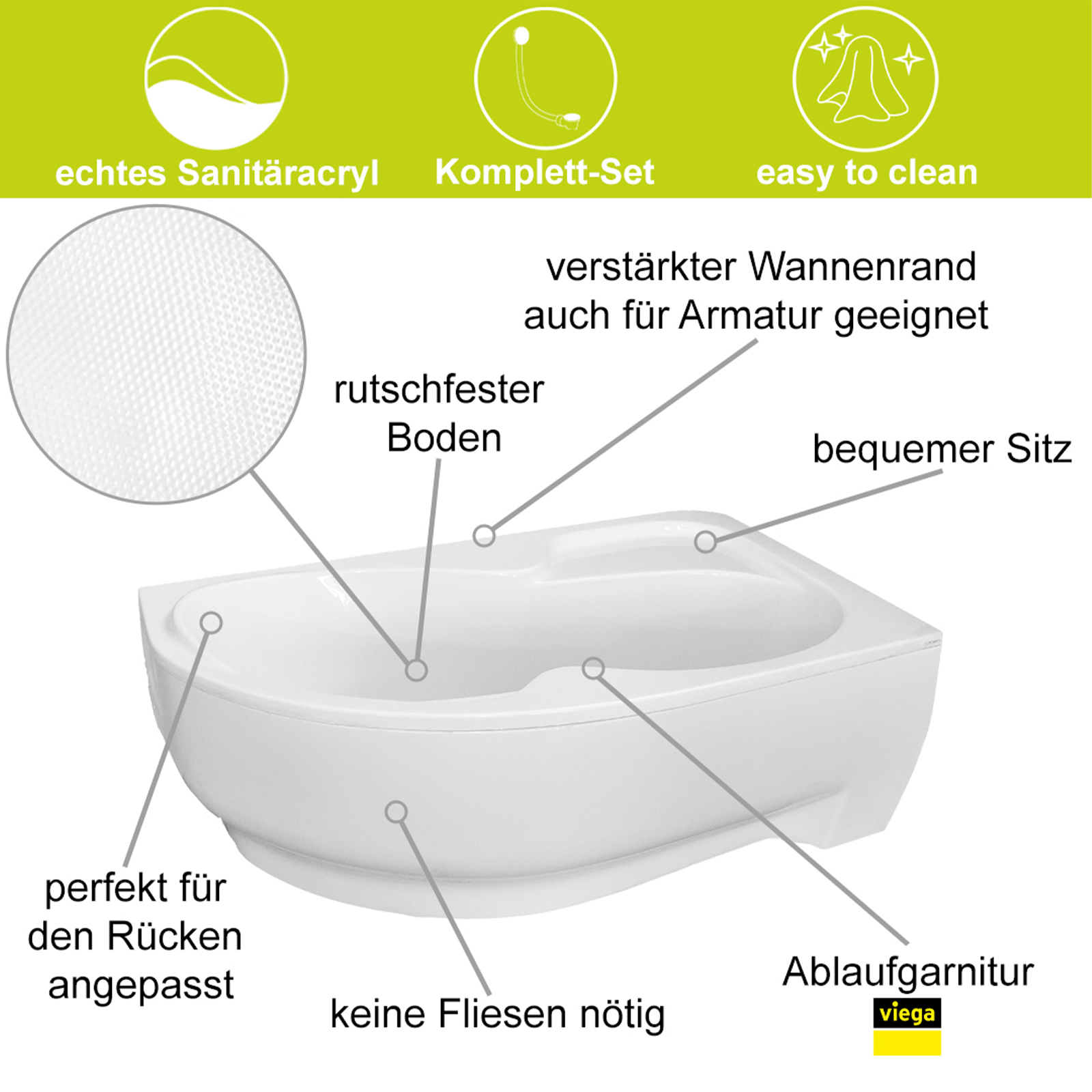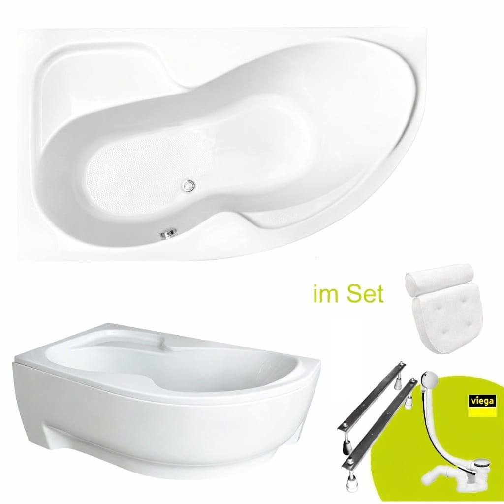 Badewanne Wela 150x100 cm links Kopfkissen Sole Eckbadewanne + Ablaufgarnitur Viega