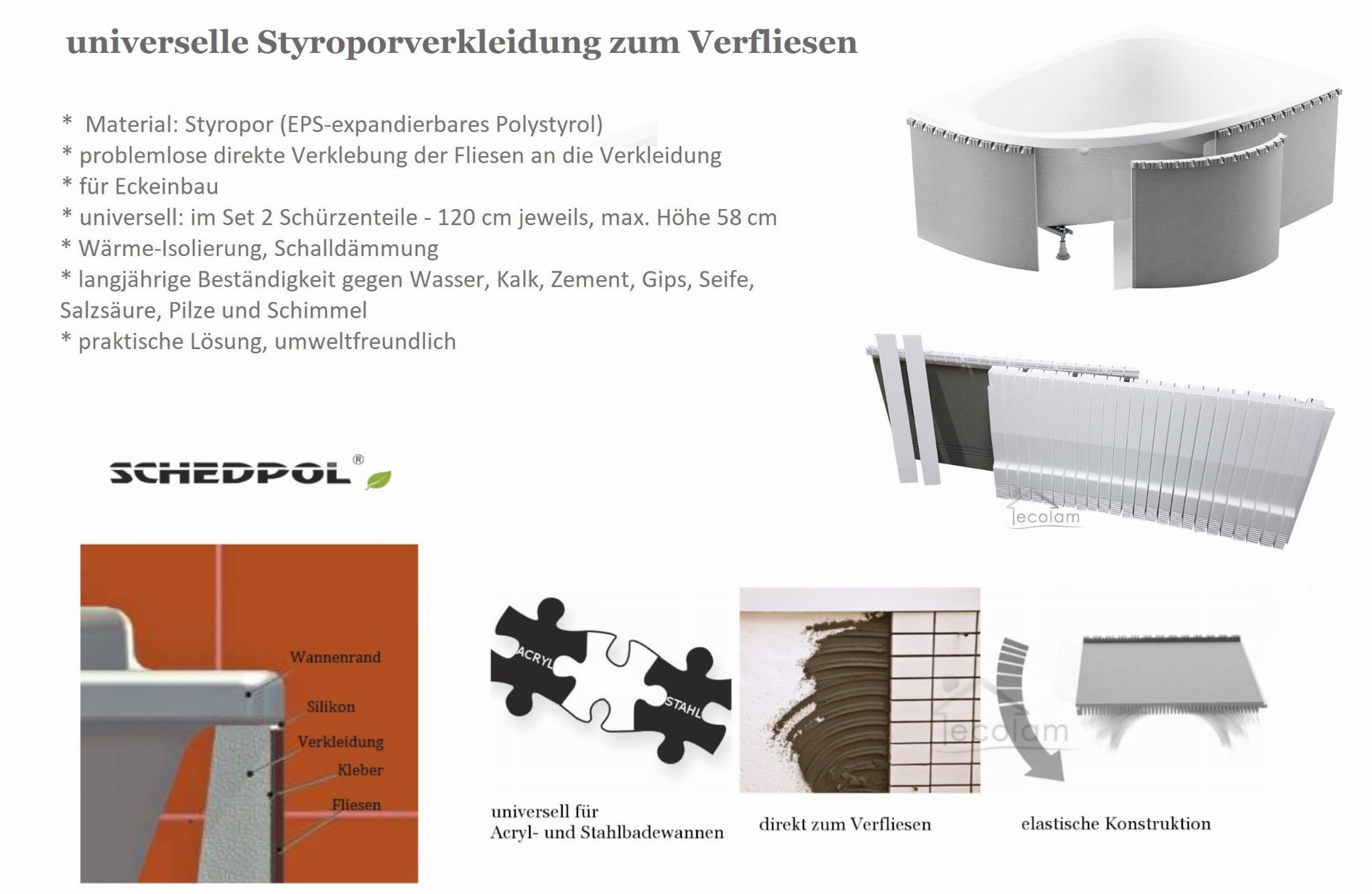 Material: Styropor (EPS-expandierbares Polystyrol), universell: geeignet für Eckbadewannen mit Bogenlänge bis 240 cm, max. Höhe 63 cm, einfache Montage, leichte Konstruktion, Wärme-Isolierung, Schalldämmung, Hersteller: Schedpol