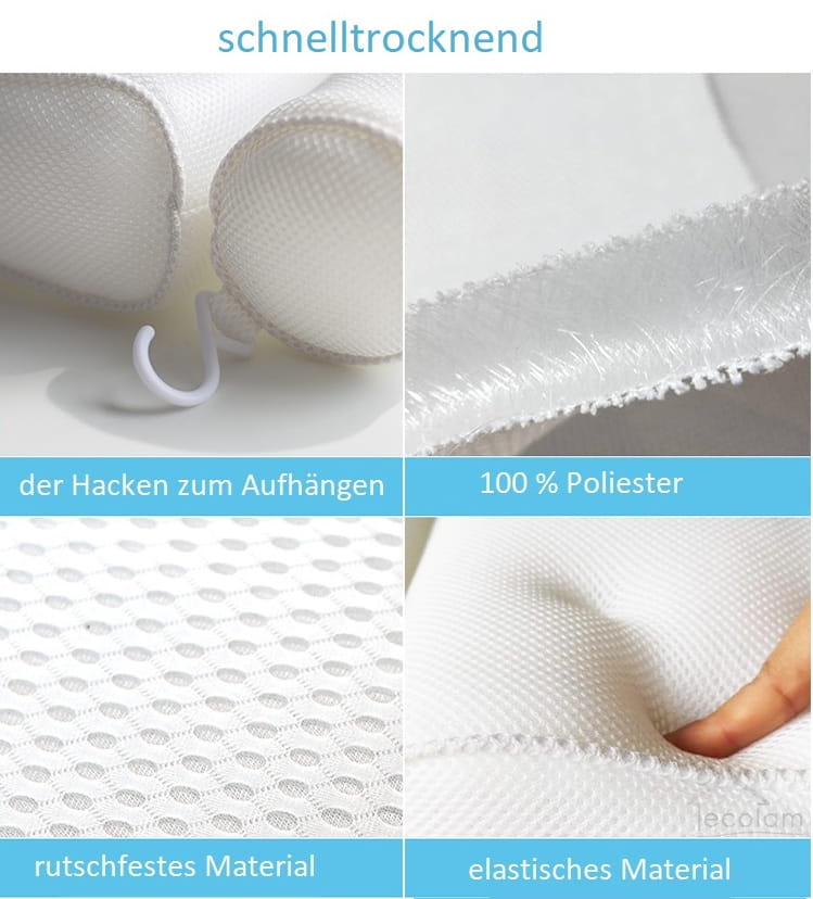 Material: Poliester, thermoplastischer Schaum, schnelltrocknend; Farbe: weiß, leicht zu reinigen, für Waschmaschine geeignet; Montage: einfache Montage mit den Saugnäpfen; bequem - Stützfunktion für Kopf, Nacken, Schulter und Rücken