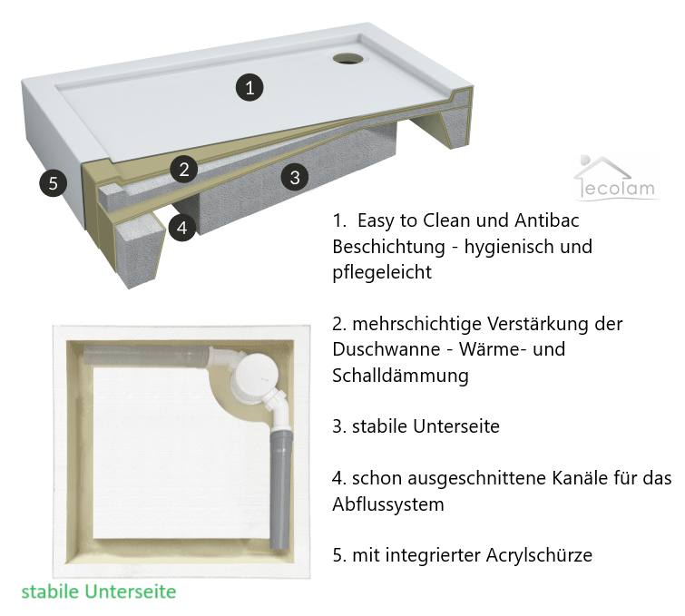 - Material: Sanitäracryl mit Verstärkung (Glasfaser, Harz), einfach zu reinigen, vergilbt nicht; Unterseite Styropor